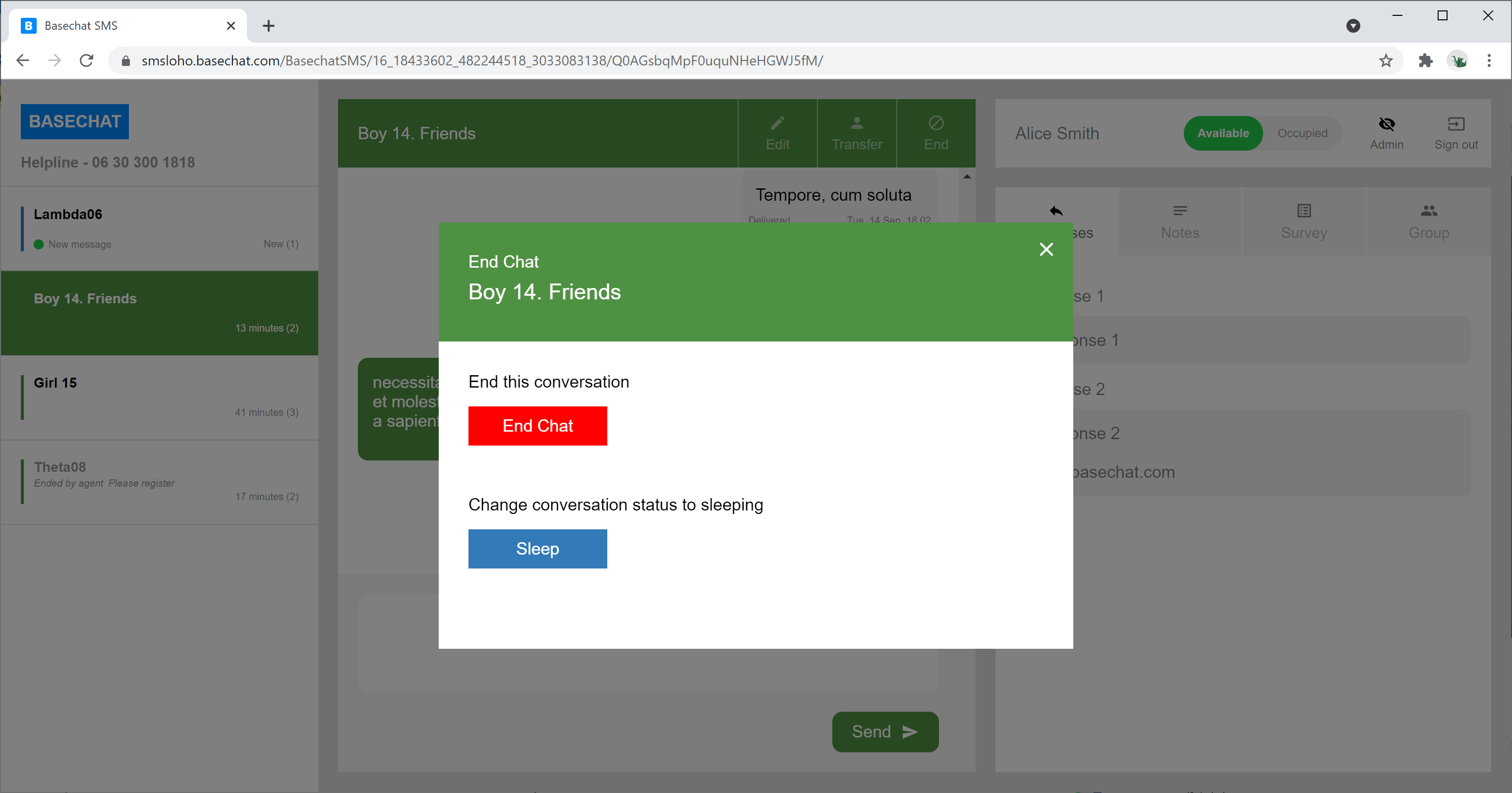 The counsellor ends the conversation. As an alternative to ending, the counsellor can choose to sleep the conversation, meaning the same conversation can continue if the user makes contact again. When a user don't answer a counsellor's message, the conversation is automatically moved to the sleeping-state after a set period of time.