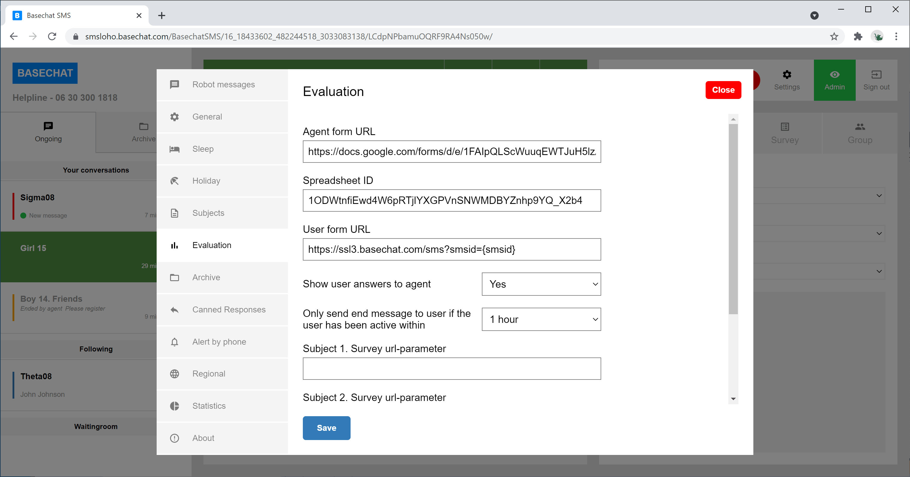 When the conversation ends, the user can fill in a survey. Answers are saved in spreadsheets and can be shown to the counsellor.