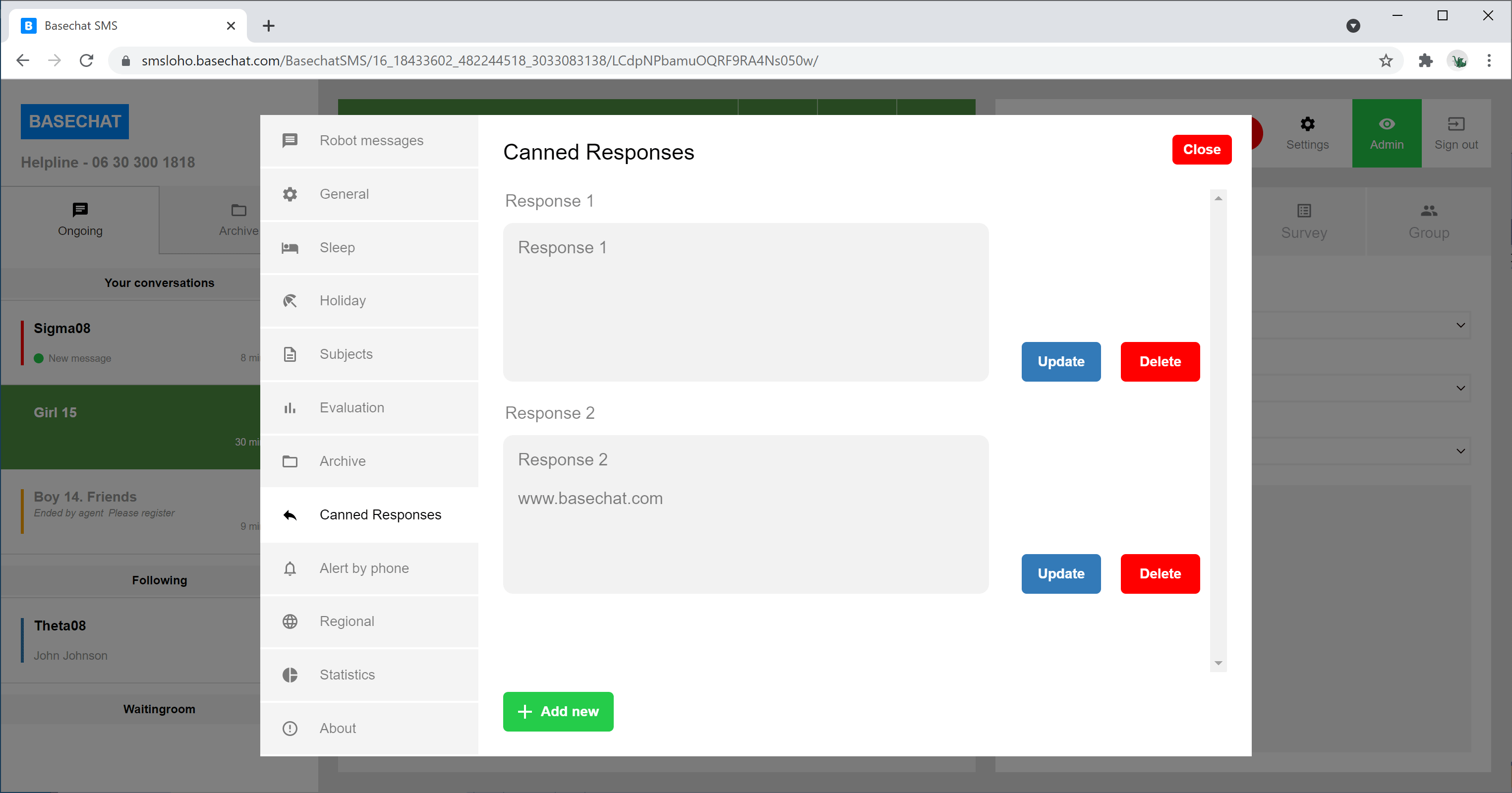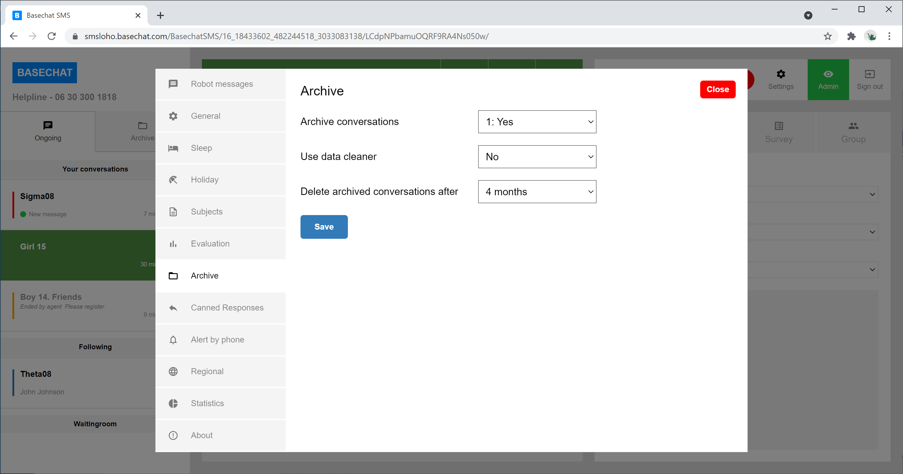 Settings for sleep. When a user don't answer a counsellor's message, the conversation is automatically moved to the sleeping-state after a set period of time.