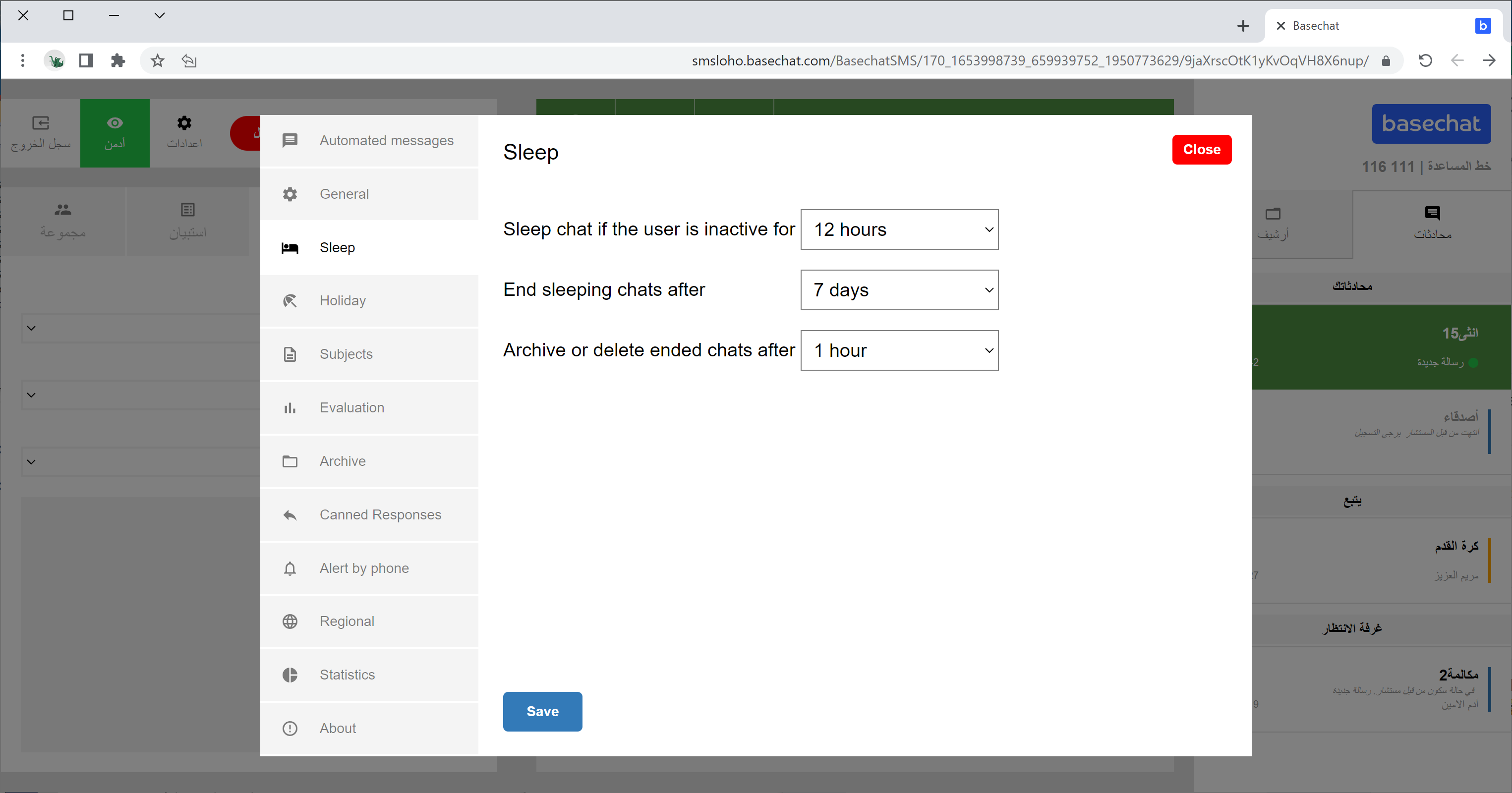 إعدادات حالة السكون. عندما لا يرد المستخدم على رسالة المستشار، يتم نقل المكالمة تلقائياً إلى حالة السكون بعد فترة زمنية محددة.