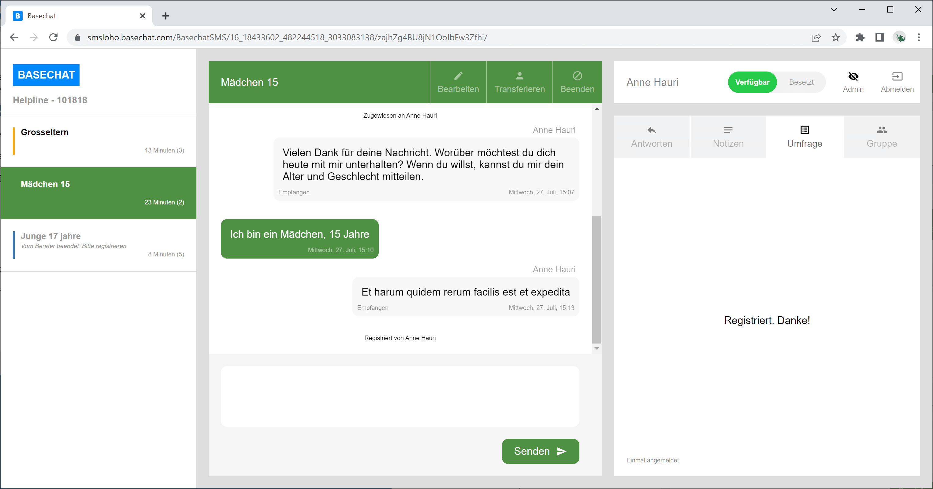 Nach Beendigung des Gesprächs kann der Nutzer eine Umfrage ausfüllen. Die Antworten werden gespeichert und können dem Berater gezeigt werden.