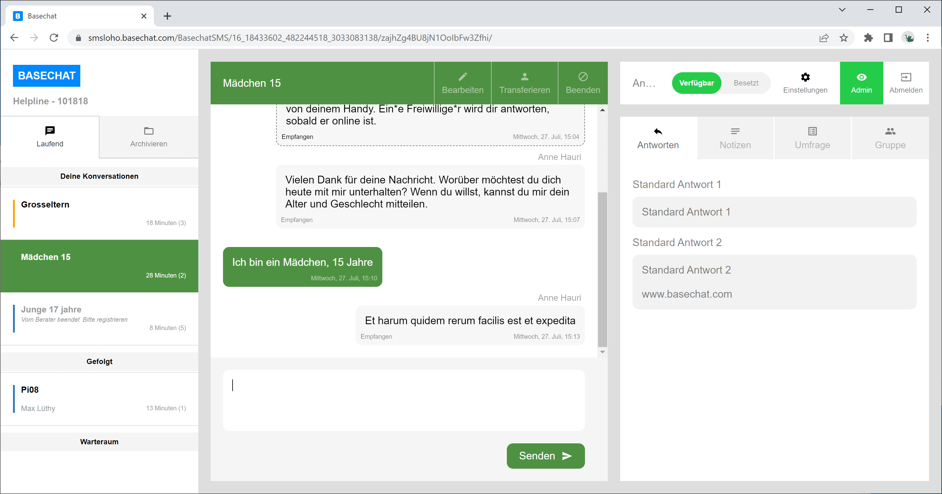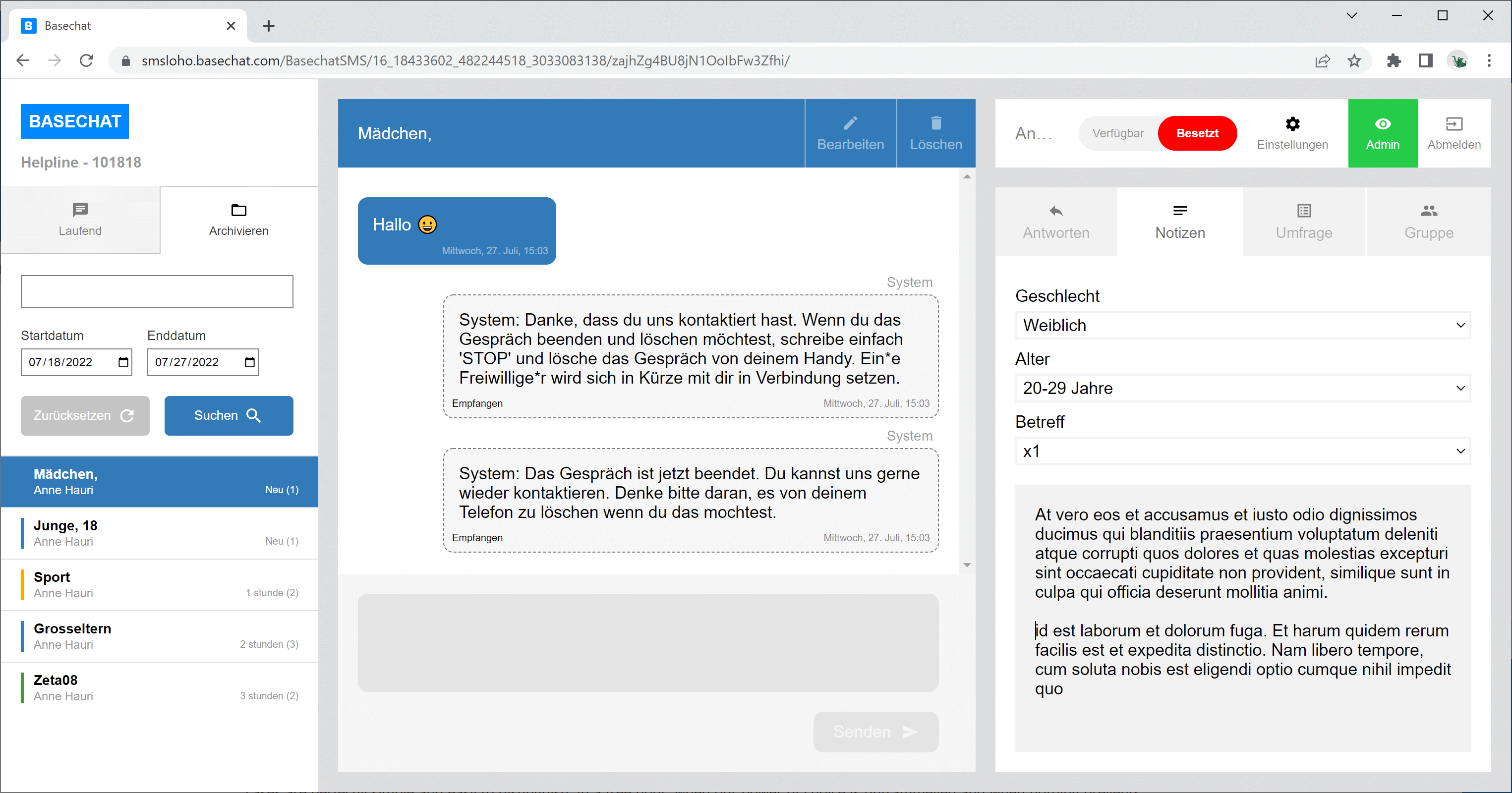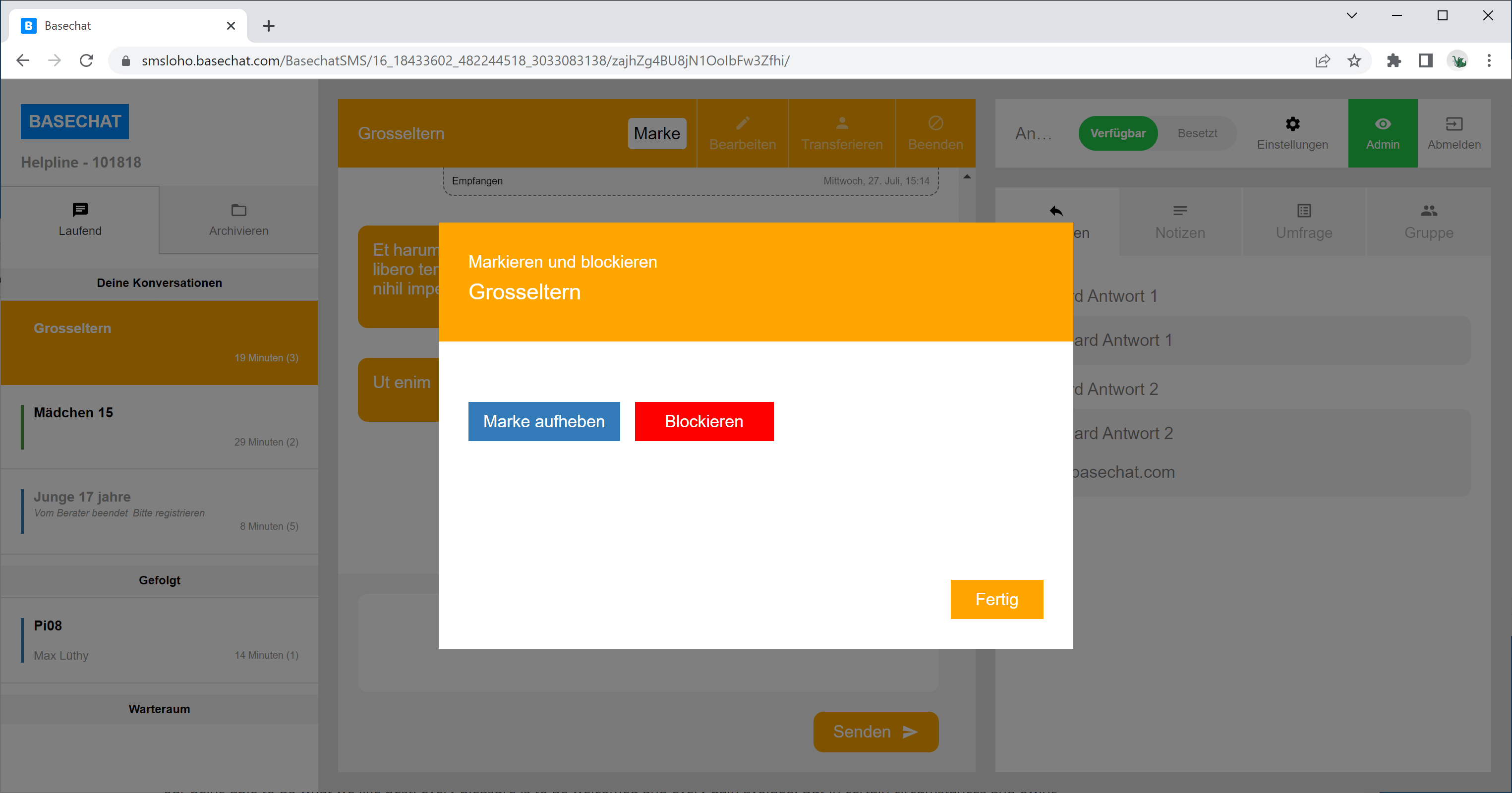 Ein Administrator wählt den Admin-Modus und kann nun laufende Unterhaltungen verfolgen.