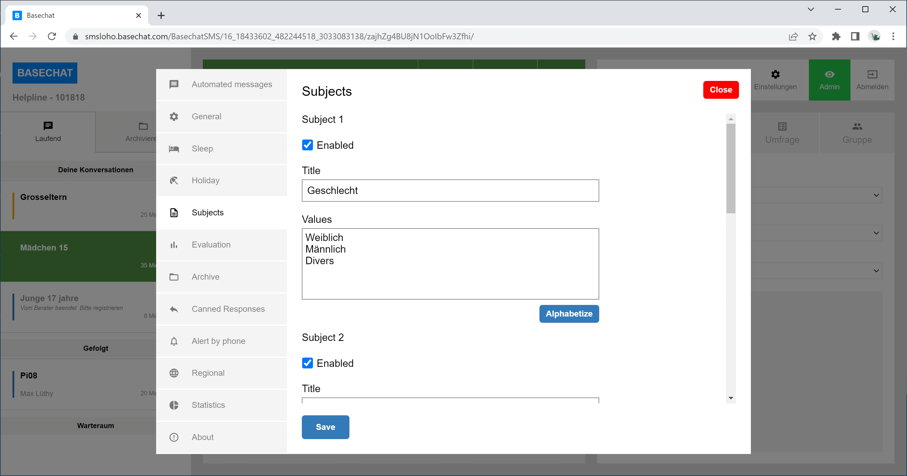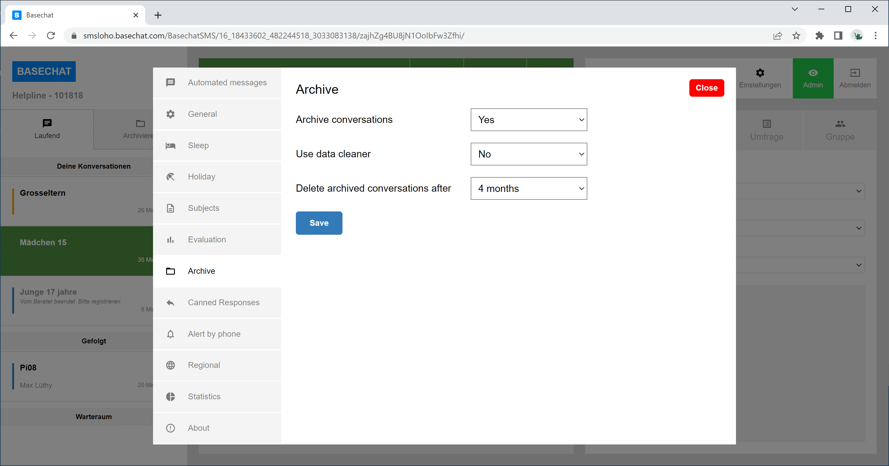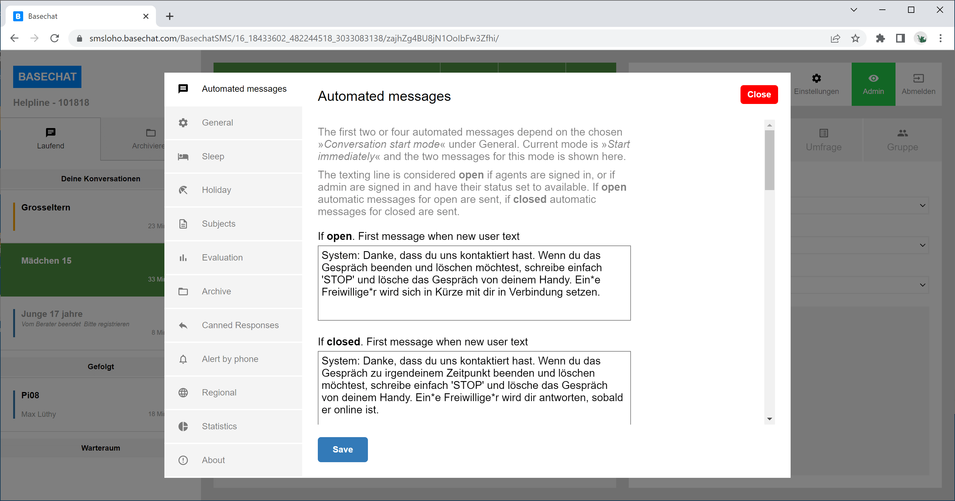Ein Administrator wählt den Admin-Modus und kann nun laufende Unterhaltungen verfolgen.