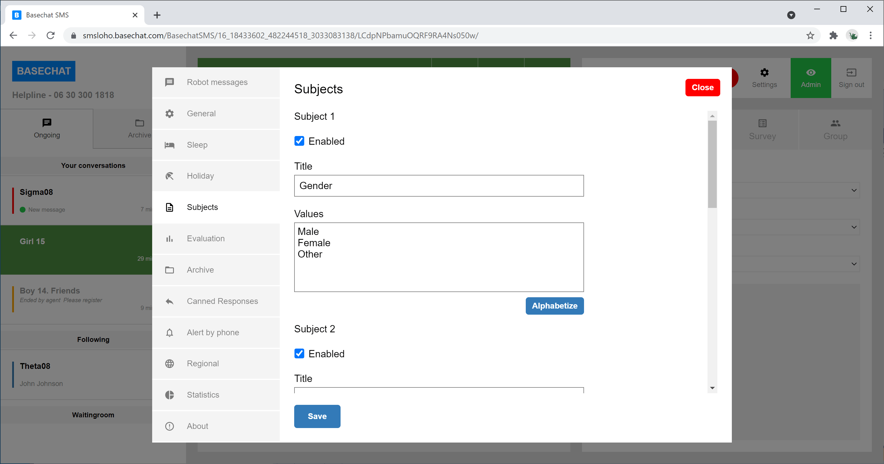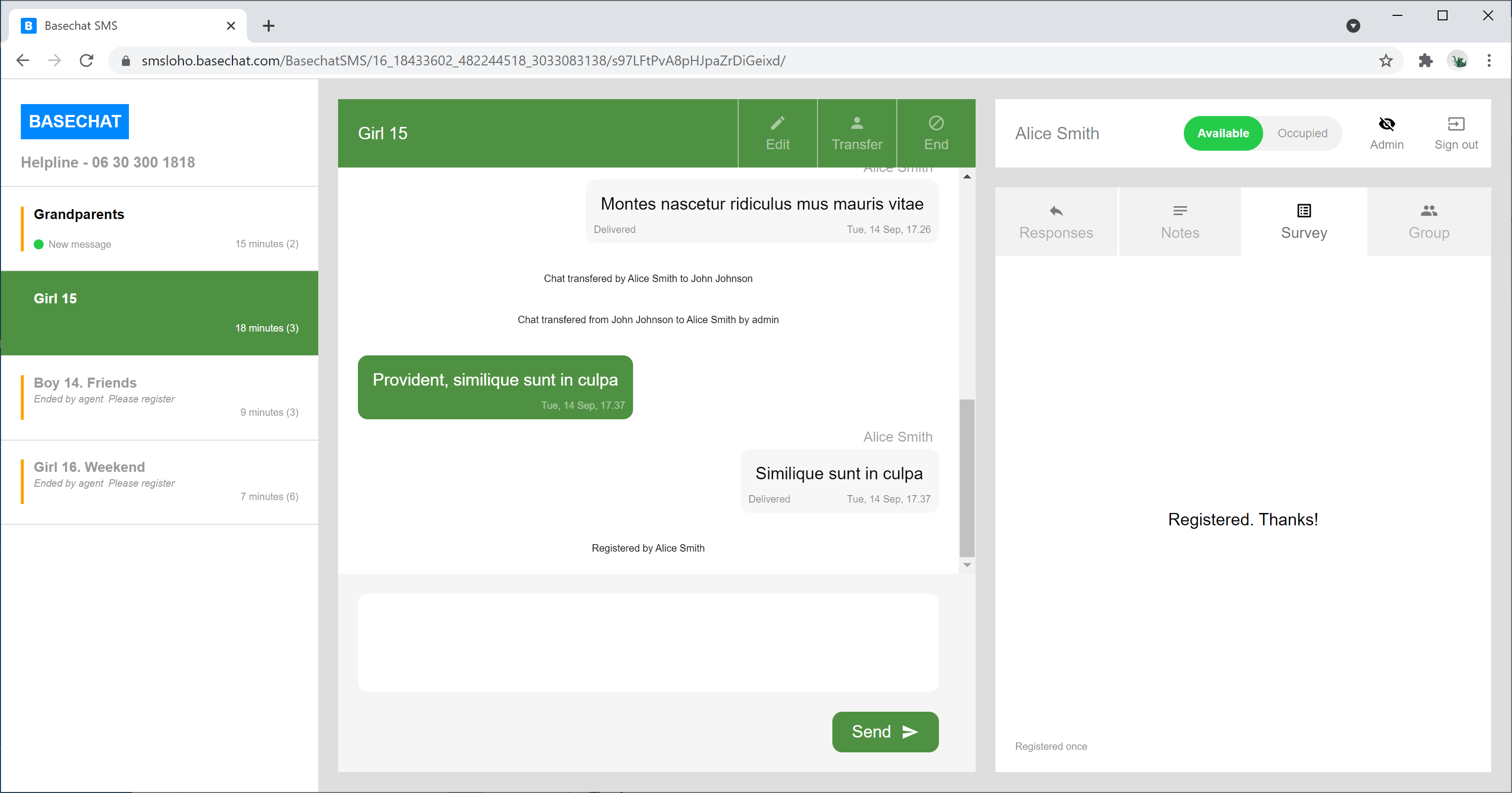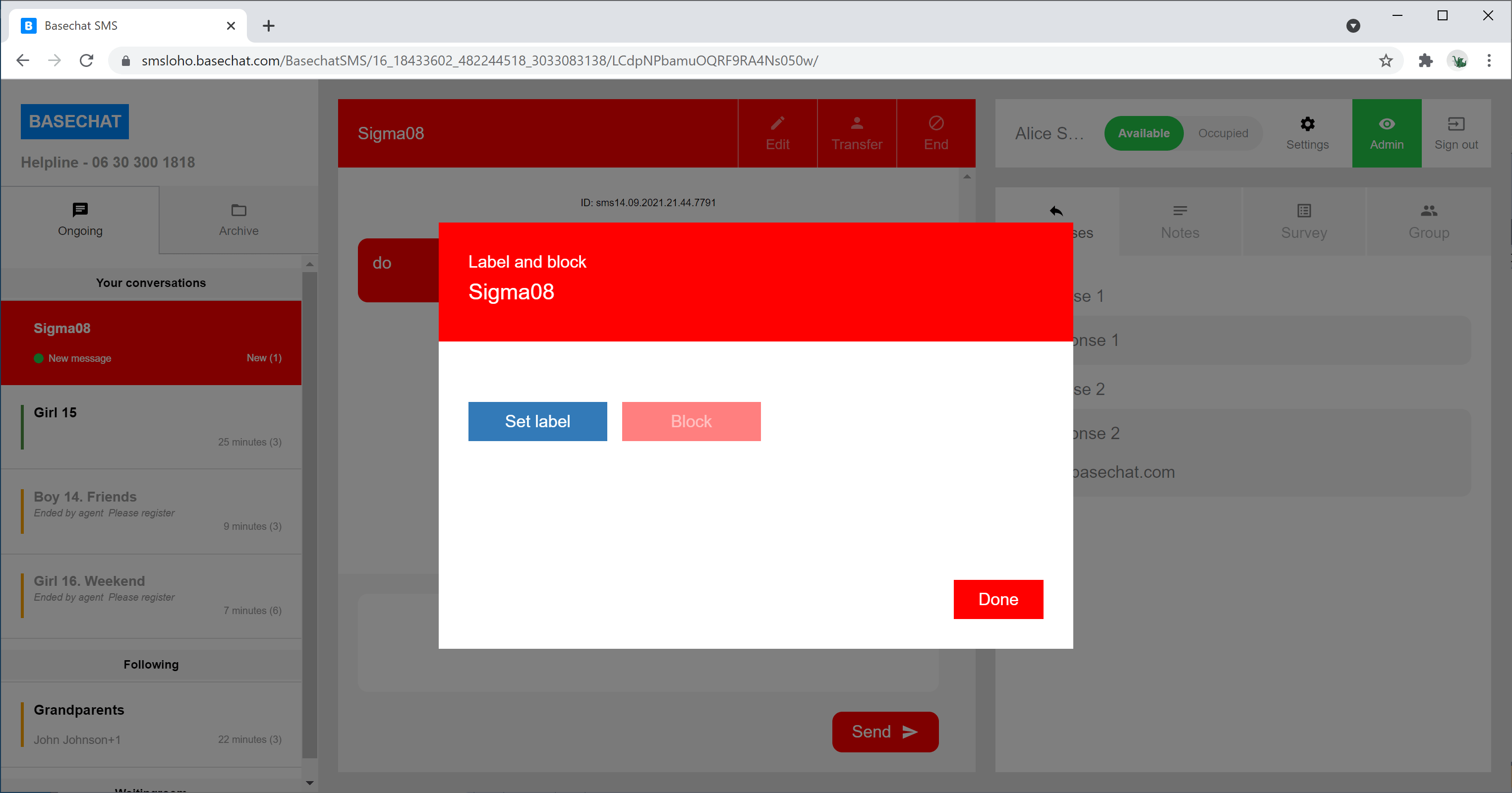 The counsellor can take notes, and label with preset subjects. Notes and subjects are always shown with the conversations when transferred or followed, or when the conversation is ended.