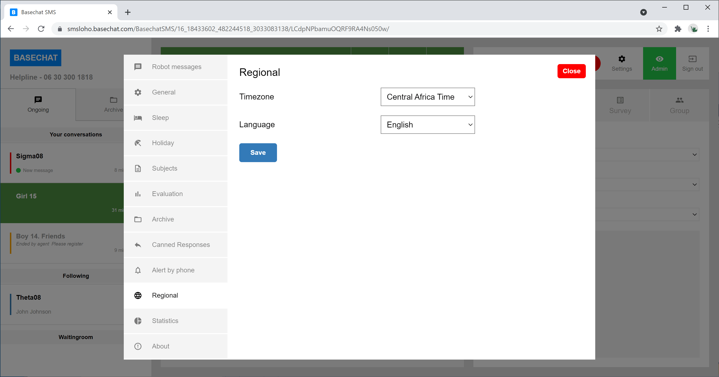 Settings for sleep. When a user don't answer a counsellor's message, the conversation is automatically moved to the sleeping-state after a set period of time.
