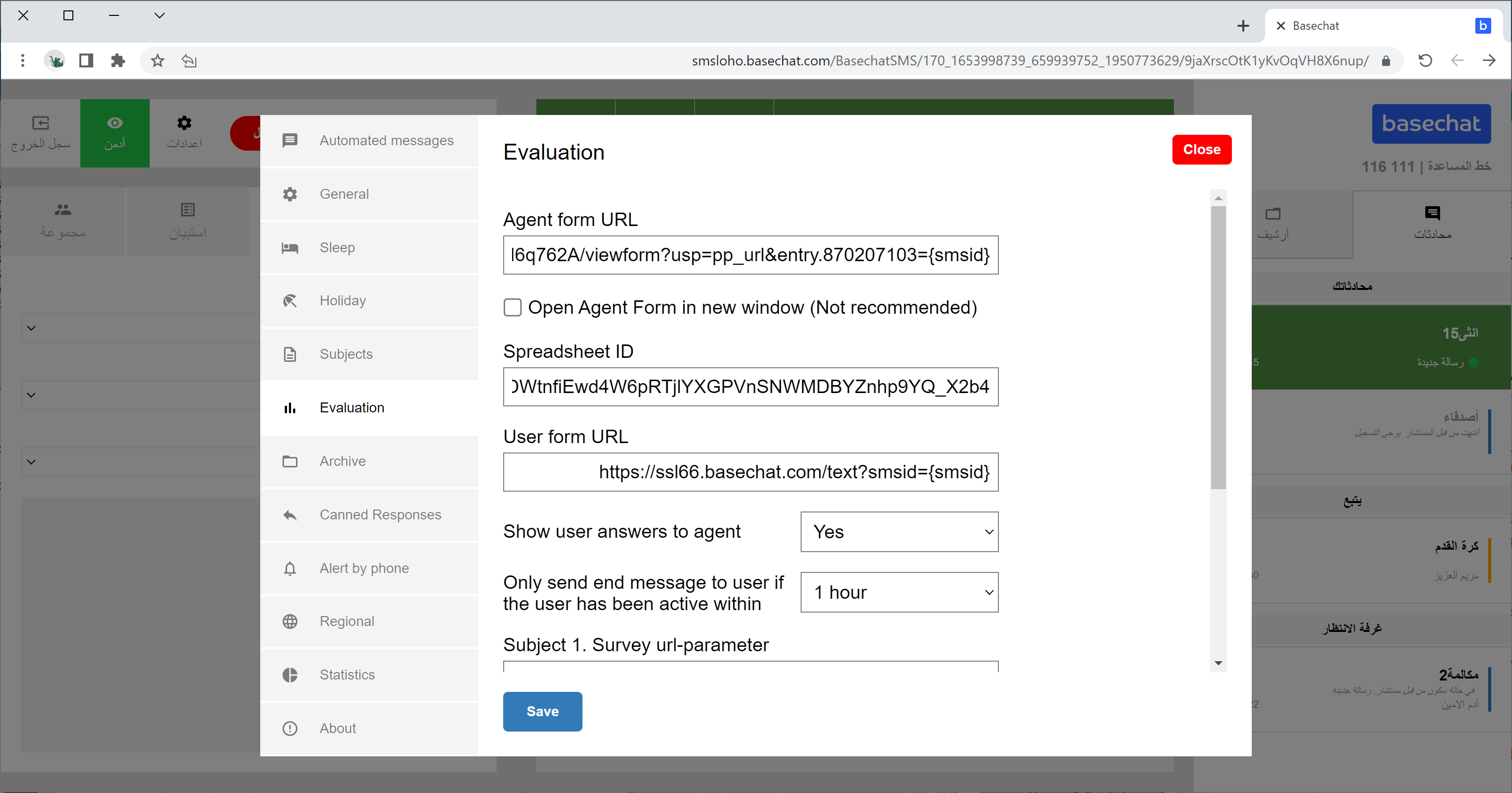 عند إنتهاء المكالمة، ممكن للمستخدم أن يملأ الإستبيان. يتم حفظ الإجابات في جداول بيانات ومن الإمكان عرضها على المستشار.