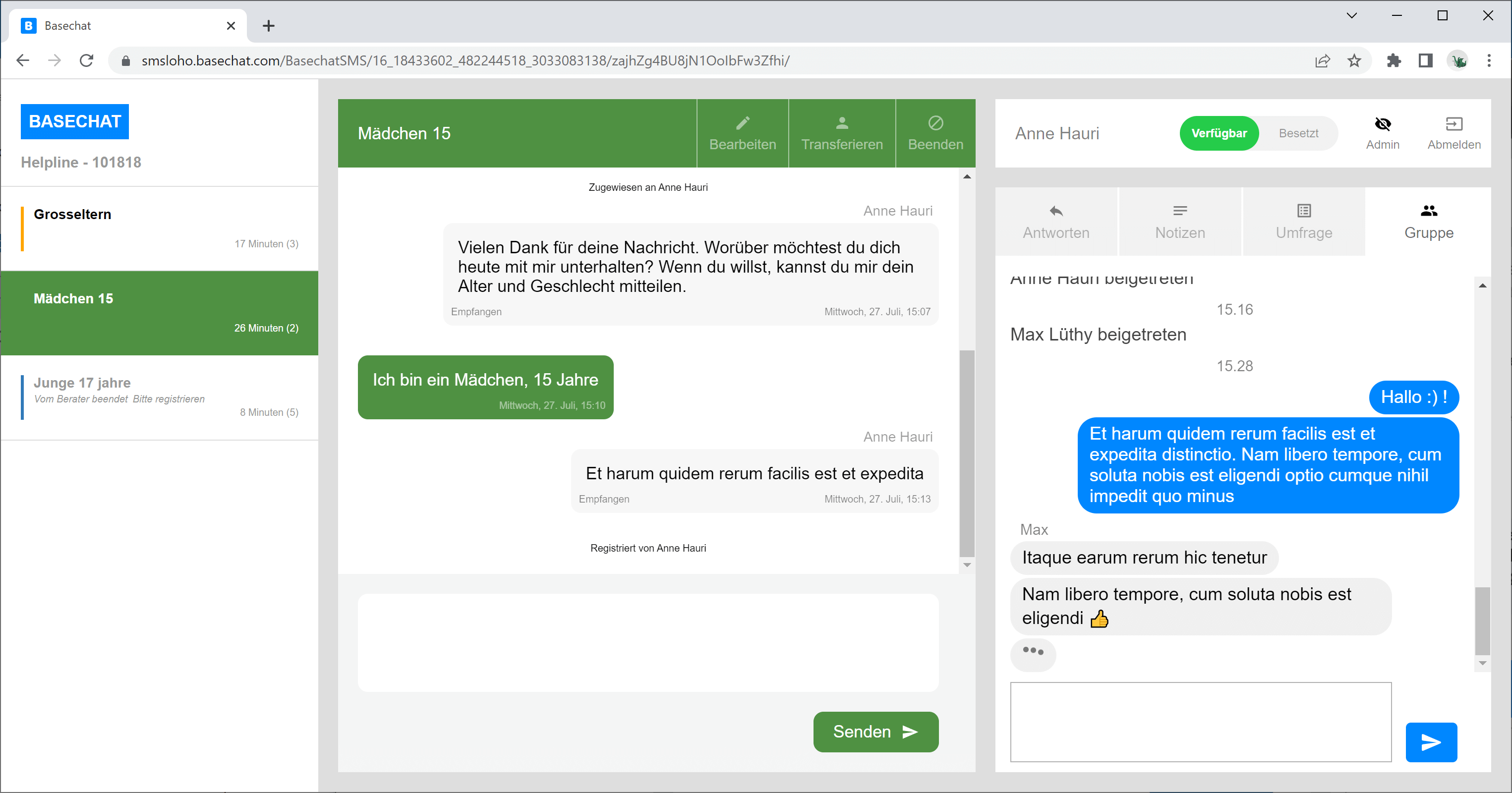 Berater und Koordinatoren können sich über den Gruppenchat unterhalten.