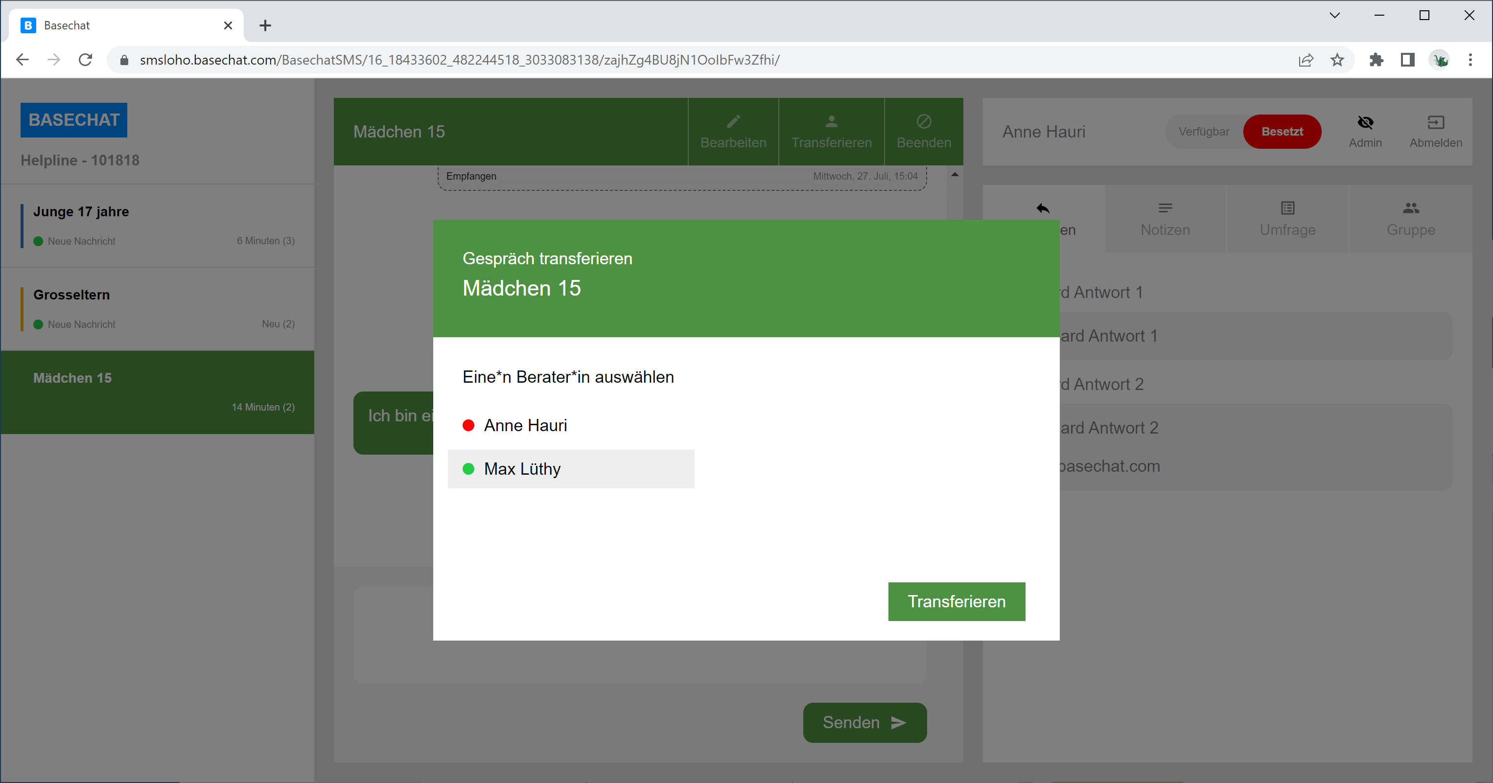Ein Administrator wählt den Admin-Modus und kann nun laufende Unterhaltungen verfolgen.