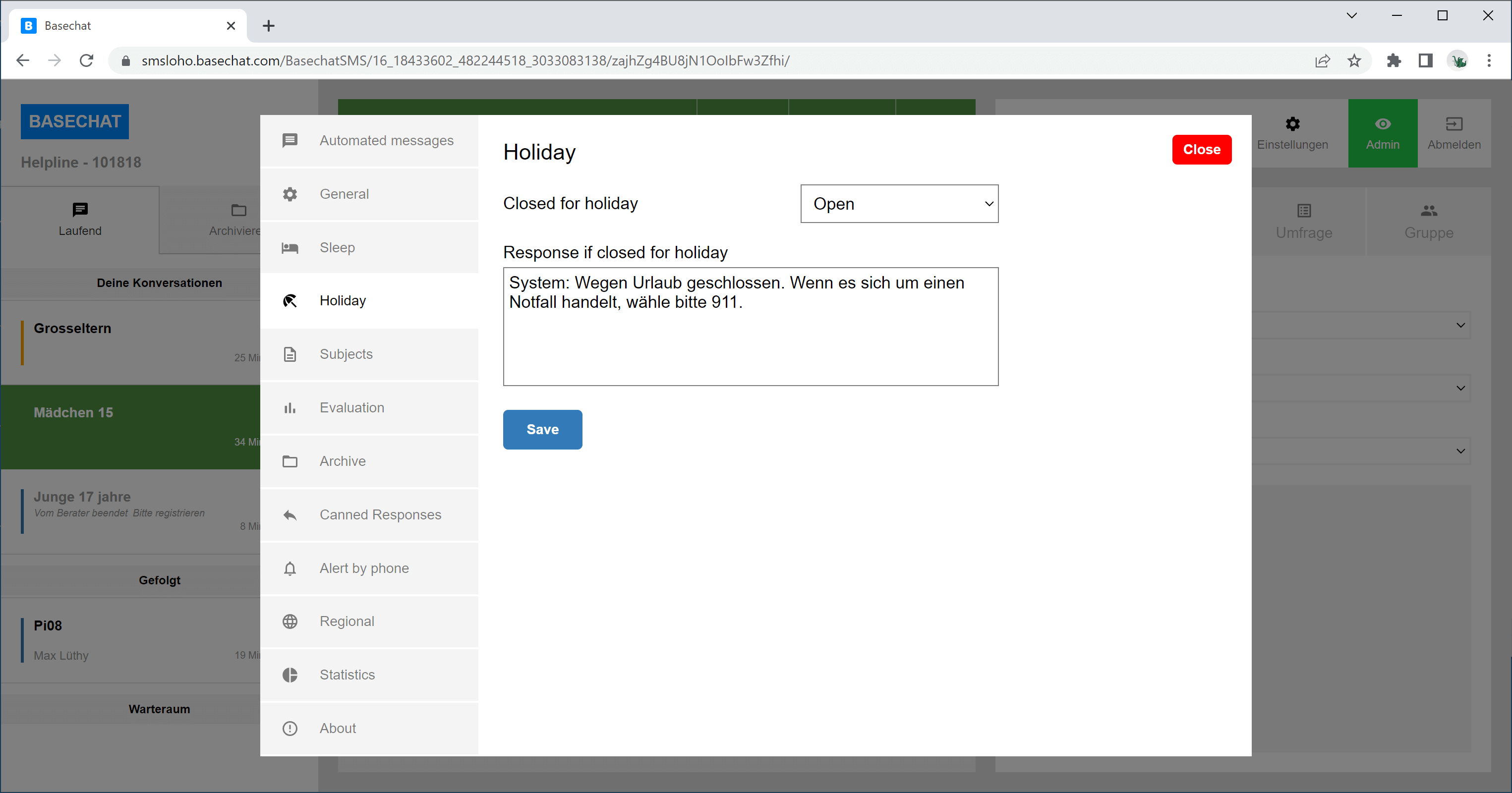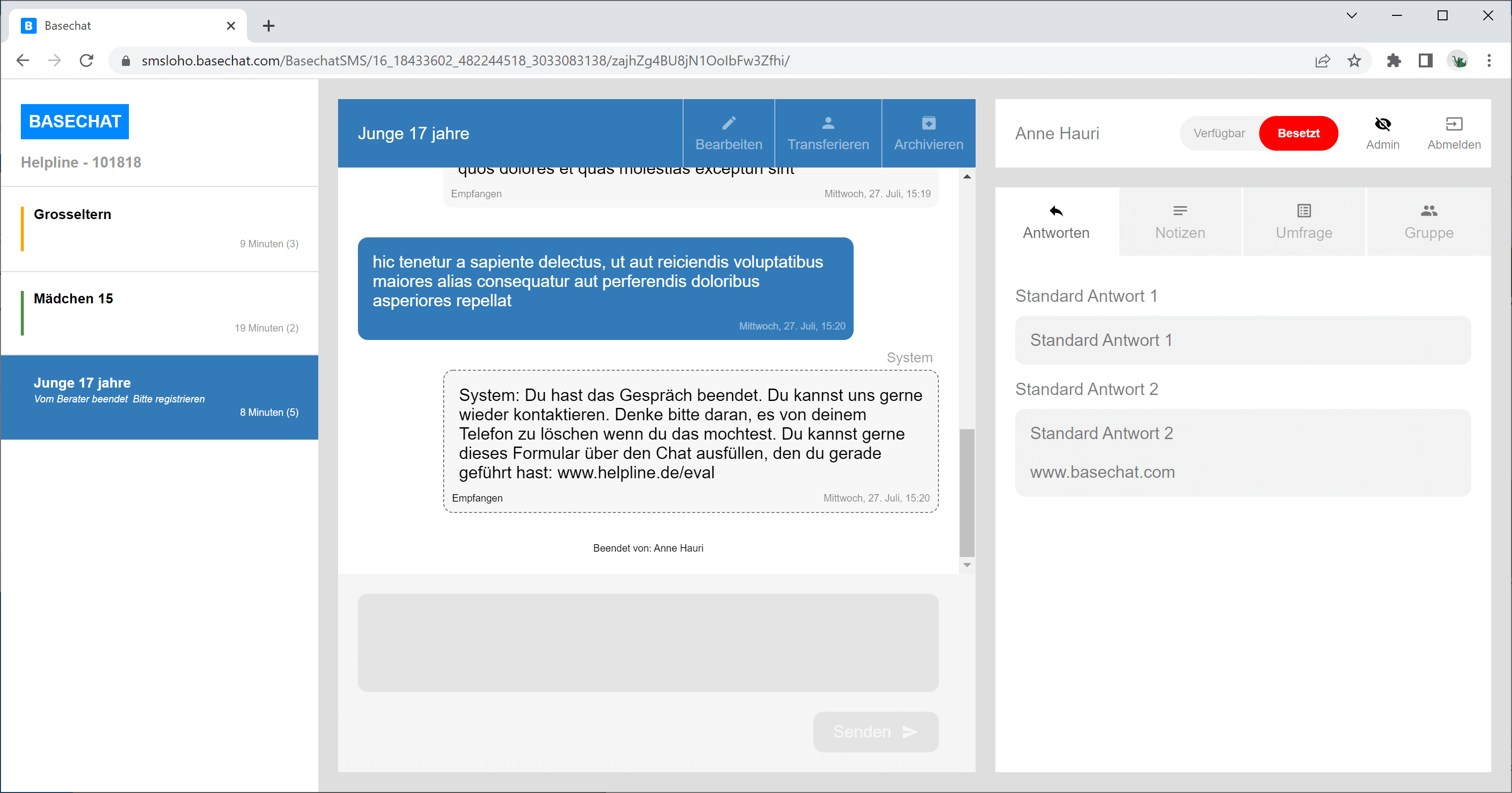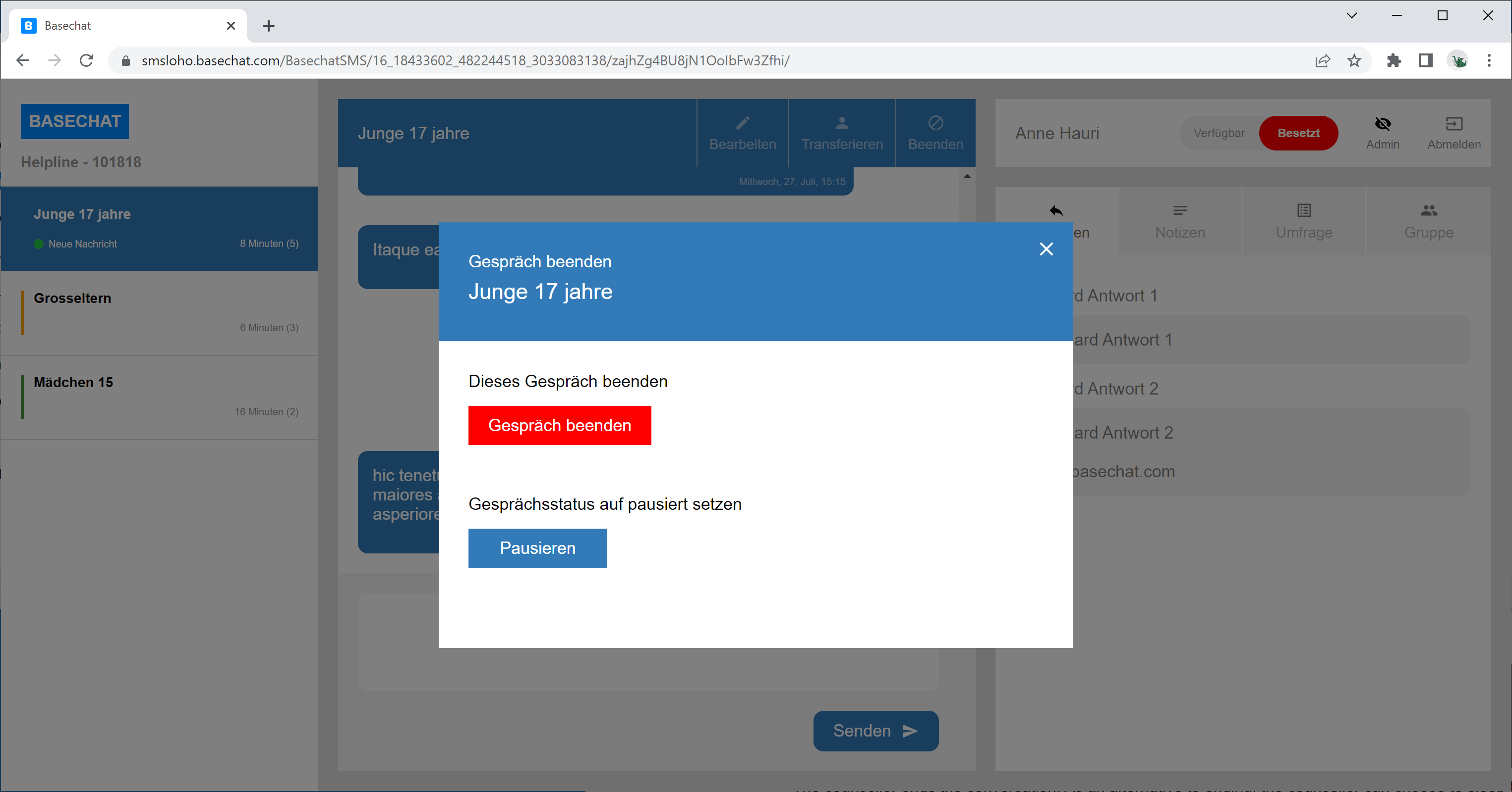 Der Berater beendet die Konversation. Alternativ zur Beendigung kann der Berater die Unterhaltung ruhen lassen, d.h. die gleiche Unterhaltung kann fortgesetzt werden, wenn der Nutzer erneut Kontakt aufnimmt. Wenn ein Nutzer auf die Nachricht eines Beraters nicht antwortet, wird das Gespräch nach einer bestimmten Zeit automatisch in den Ruhezustand versetzt.